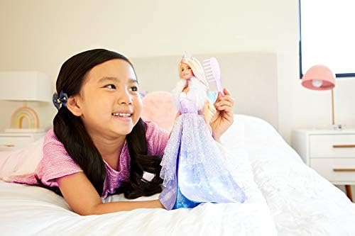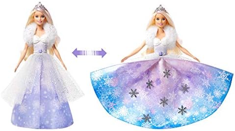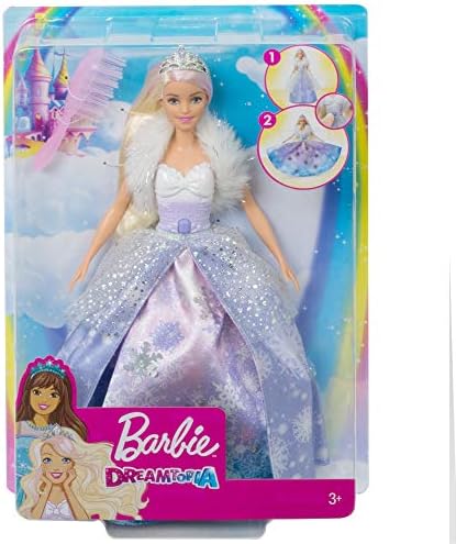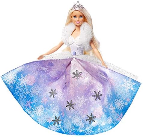 Inspire a fashion fairytale with Barbie princess doll from Barbie Dreamtopia! This princess doll is dressed for a royal occasion in a layered gown with a snowflake print, icy-cool colors and lots of sparkle. A glittery bodice with a white-to-purple ombre effect and bow detail is complemented by a soft, faux fur shrug. Press the button on Barbie doll’s bodice for a wow moment -her dress will fan open revealing silvery snowflakes and shades of lavender, blue and pink! An icy-pink streak in Barbie doll’s long, blonde hair adds fantasy flair, and a hairbrush is included so young imaginations can help her get ready for a royal adventure. It’s easy to play out dreams real and imagined with Barbie because when you enter Dreamtopia, you wake up to a world where dreams become reality! Collect more Barbie Dreamtopia dolls and toys and let your stories take flight. Each sold separately, subject to availability. Doll cannot stand alone. Colors and decorations may vary.