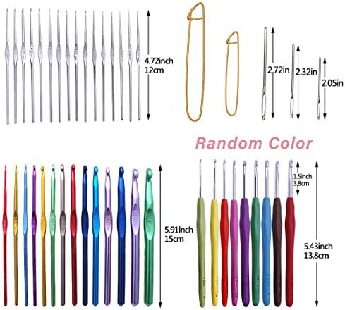 Package Included: 9 pieces large eye blunt needles steel yarn sewing needles, 9 pieces rubber handle crochet hooks, 20 knitting stitch markers,30 pieces aluminum handle crochet hooks,2 metal stitch holder pins and 1 knitting gauge. Compact crochet kit can meet your different demands in crocheting.