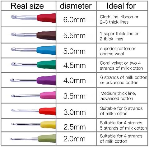 9 colorful rubber handle crochet hooks: size: 2mm, 2.5mm, 3mm, 3.5mm, 4mm, 4.5mm, 5mm, 5.5mm, 6mm. The crochet hook colors are shipped randomly, and the soft rubber crochet handle makes the crochet hook very comfortable even when used for a long time. Suitable for complete crochet sets who like to crochet.