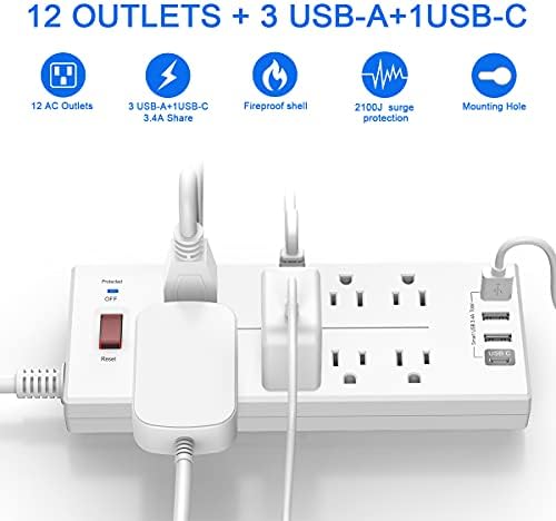 【Surge Protector Power Strip with usb】 Special design widely spacing AC outlets (2 inches) for large adapters with 6 standard spacing outlets, 4 USB ports total 3.4 A/17W, each USB A port features 2.4A Max output. USB C charging port features 5V/3A MAX, Built- with smart technology, detecting charging devices and deliver optimal charging speed