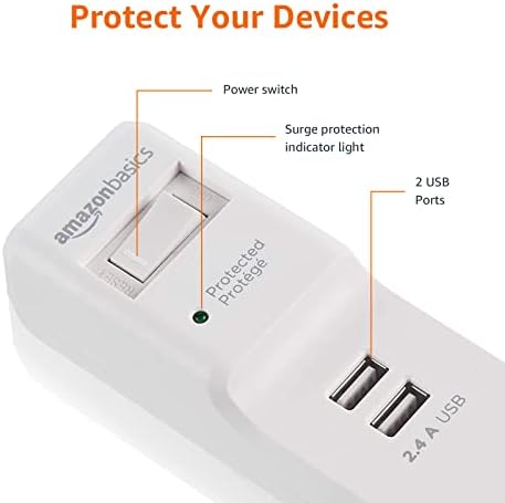 Amazon Basics 6-Outlet Surge Protector Power Strip, 2 USB Ports, 2 Ft Cord – 500 Joule, White, 2-Pack