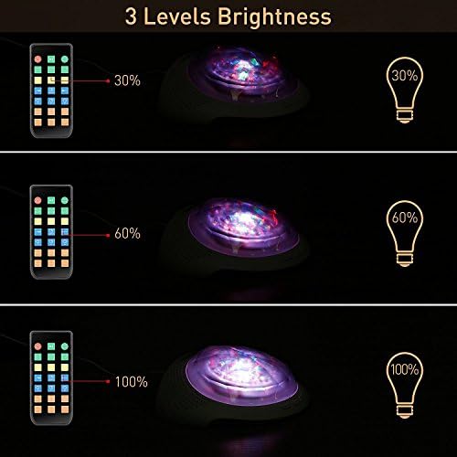 ◆Timer & adjustable brightness: ◆It has 4 timer options (1/2/4 hours and timer off) for what you needed. 3 levels of brightness (30%, 60%, 100%) to select. ◆The projector comes with a blurry lid, You can take off the lid to make the aurora light become a clearer halo effect.