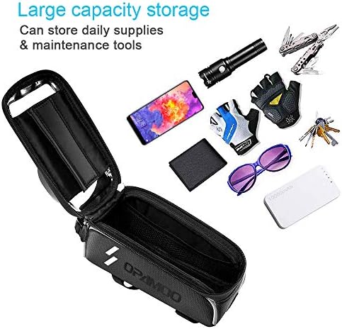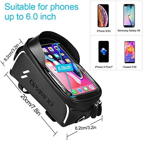 【BIG SPACE & AMAZING COMPATIBILITY】 bike bag has enough inside room for long rides, holds a lot of stuff like cellphone, charger, power bank, USB cable, bicycle repair tools, small tire pump. Perfect compatible with cellphones below 6.5 inches, iPhone XR XS MAX X 8 7 6s 6 plus 5s / Samsung Galaxy s8 s7 note 7, shake-proof and non-deforming bike front frame bag