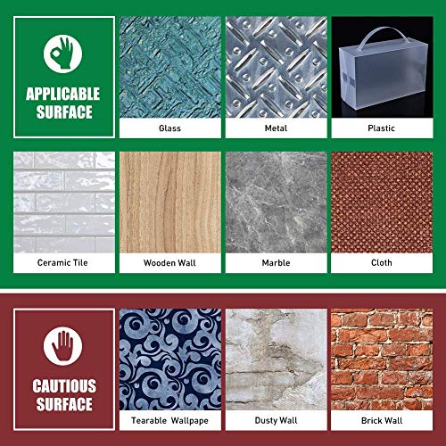 Wall surface available and unavailable: double sided tape heavy duty, can be applied for smooth surface, such as glass, mental, plastic, ceramic tile, wooden wall, marble. But not allowed for uneven surfaces, such as wallpaper, dusty wall, brick wall, broken wall.