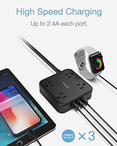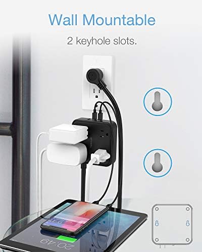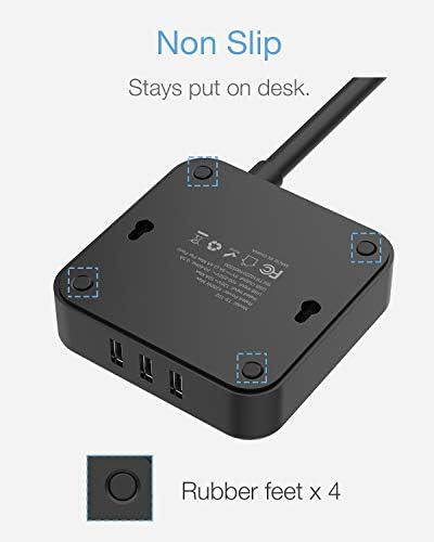 Portable and MultifunctionalThe compact square powerstrip with 4 AC outlets and 3 USB charging ports, will maximum space-saving at home, office or in your travel bag. The wide-spaced outlet will fit the big plugs without blocking each other. The USB charging ports will charge your smartphone, tablet, and many other USB devices without an adapter.Customized Overload Protection SwitchWe designed and customized an overload protection switch to safeguards your expensive computers, tv, and all other electronic devices from overload, short circuit, voltage fluctuations. The reliable overload switch will trip off automatically to protect your devices and your home when the power overload.Flat plugThe flat plug features alow profile fit easily in tight spaces, and the 45 degrees angled plug to keep other outlets available, is the ultimate space-saving power strip for your home, hotel, dorm room, or travel.Widely spacedWidely spaced outlets fit for big power adapters without blocking adjacent outlets. Easily plug in your PC, printer and more. Four 3-prong outlets and 3 USB sockets for a total of 7 plugs at a time. Saving your space and making your desktop organized;Wall mountableMount this USB power outlet on the wall/desk/nightstand would be easily by 2 slots on the back.1. Measure the distance between the 2 slots with the vertical and horizontal direction on the back of the power bar.2. Punch 2 holes on the baseboard with the distance you just measured and insert two self-tapping screws(PA2.5 to PA3.5)3. Hang the outlet strip on the screws then pull it down a little to make sure the strip is tight.Specification:Input Voltage: 100~240V AC50/60Hz;Electrical Rating: 125V~,10A, 1250WUSB Output: 2.4A each port, 3A in Total;Cord Length: 5 ft/1.5m