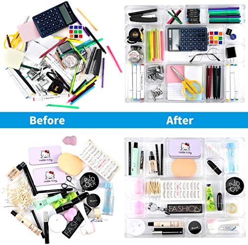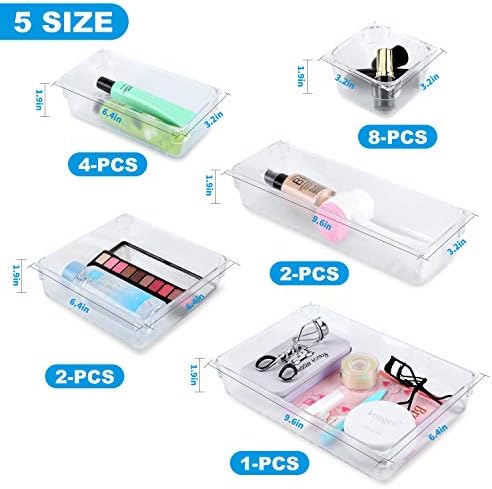 17 pcs organizer in total, great value setCome with 5 sizes for specific need and best solutionHigh quality acrylic material madeTransparent and frosted design, elegant for any décorAllow to split up and join together to fit drawer in any size68 Pcs anti-slip rubber foot pads included, 4 pads for each organizerVersatile Drawer Organizer: Ideal for dresser, bathroom, kitchen, office drawers, organizing cosmetic, make up tools, nail polish, hair accessories, jewelry, etc.