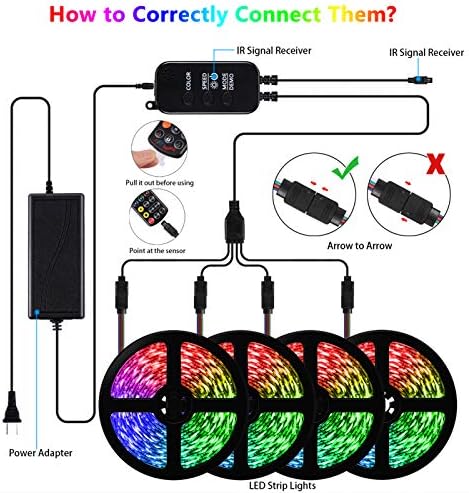 Please clean the surface of the attachment before installation, ensure that the adhesive surface is smooth, and make sure the surface clean, flat and dry.Make sure the arrow is aligned with the arrow. Otherwise the light strip will not work.Please ensure that each end of the controller is only connected to a roll of light strips.This product is not waterproof, it is recommended to use it in a dry environment.Please pull out the transparent insulation sheet inside the remote control before using the remote control.