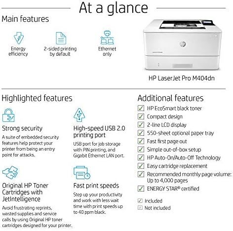 It’s built to keep your business moving forward—the HP LaserJet Pro M404dn keeps up with how you actually work, collaborate, and get things done. With fast print speeds, best-in-class security, and built-in Ethernet capabilities, this monochrome laser printer is designed to let you focus your time on growing your business and staying ahead of the competition. This black and white laser printer is also designed with the environment in mind; save up to 18% energy over prior products with HP EcoSmart black toner, and help save paper right out of the box with the default paper savings mode.