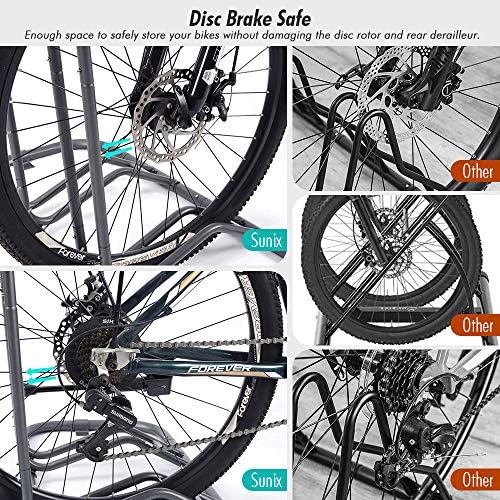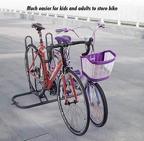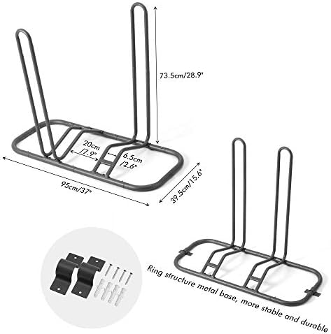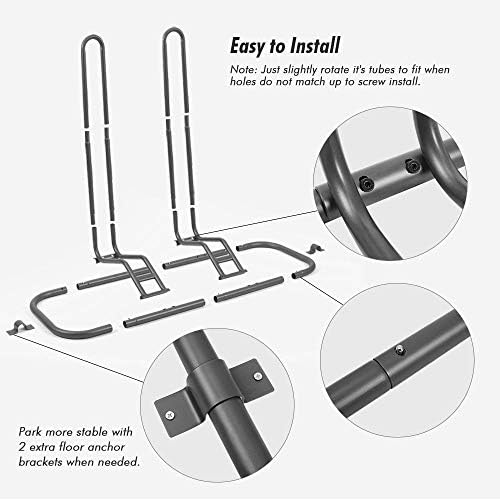 Universal Bike Storage Rack: Suitable for most types of bicycles including bicycles with disc brakes, fits tire size up to 2.6″/66 mm.Dual Purposes: This bike floor stand can be custom assembled in the same direction or opposite direction, park in dual direction, depending on your space. In the opposite direction, one head in the next tall in to avoid a handlebars impact.More Stable & Durable: Made of durable and high-quality steel, rustproof and long-lasting durability. Feature with ring structure metal base,2 extra floor anchor brackets are available for increase stability when needed.Disc Brake Safe: Enough space to safely store your bikes without damaging the disc rotor and rear derailleur.Protective Height: Our bike storage organizer is higher than most racks, the slot height is 28.9″ (73.5 cm),prevents bikes from falling over.Quick & Easy Assembly: Quick release connecting pin, minimal hardware for assembly required. Following assembly diagram and you can assemble in minutes. Much easier for adults and kids to store their bike by rack putting on the floor.