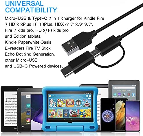 Universal Compatibility for Kindle Fire 7,Fire HD 8 8Plus 10 10 Plus tablets; HDX 6″ 7″ 8.9″ 9.7″ tablets, Fire 7,HD 8 HD10 Kids Pro tablets, Fire 7,HD 8 HD 10 Kids Edition tablets; Kindle Paperwhite, Oasis E-readers, Fire TV Stick, Echo Dot 2nd Generation, other Micro USB and USB-C Powered devices.