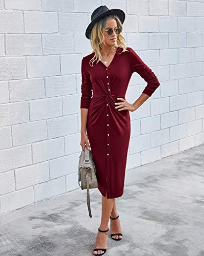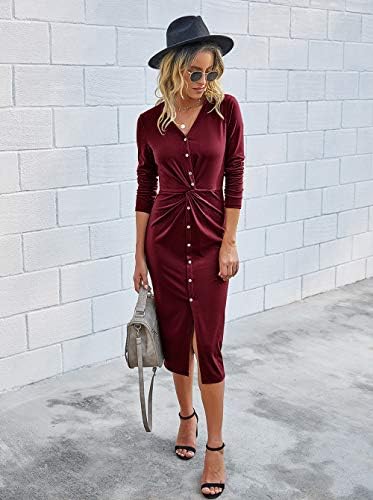 Long Sleeve Bodycon Midi DressSolid Color Twist Front DressButton Down Tunic Dress BodyconCasual Front Knot Slit Front Dress