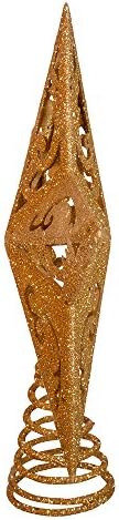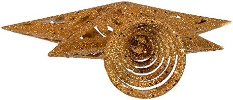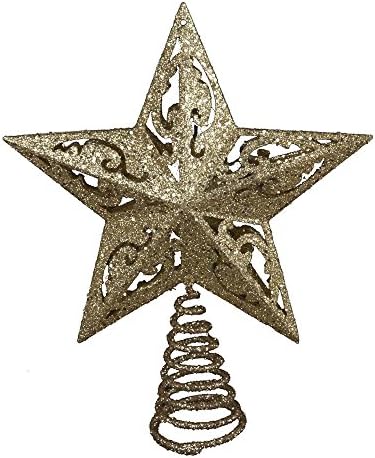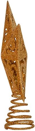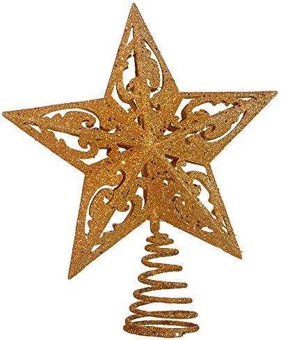 This Kurt Adler 8-Inch gold glittered 5-point star treetop is a beautiful, classic way to accent your Christmas tree. Raised for a 3d effect, this star is intricately detailed with a cutout design pattern within the center of each of the 5 points, and rests on a coil to which the topper attaches to the tree, all in a gold glittered color.