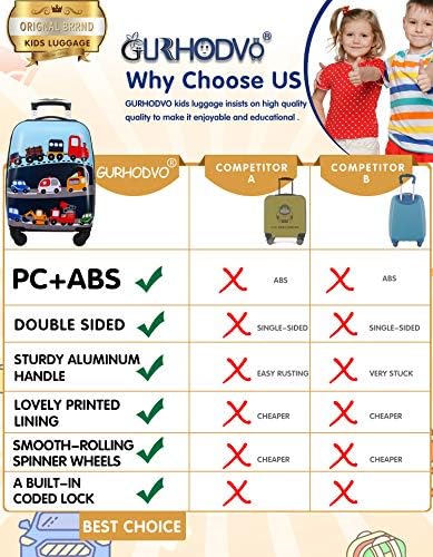 GURHODVO kids luggage insists on high quality quality to make it enjoyable and educational . GURHODVO latest designed suitcase. Stylish outlook and vibrant color will make your children luggage stand out on luggage carousel. Durability and strength are a given thanks to tough ABS/PC construction. A sturdy aluminum telescoping handle with push-button and 4 double spinners roll easily and provide stability wherever your kids travel. Build-in lock which allows children have their own secrets. Interior mesh zip pocket and elasticated, Squared full-capacity design. What we want to offer our customers is more than a solid case, but the customer’s own style and child’s personality. It’s time to get a cool luggage! Ideal gift for Birthday Christmas, Thanksgiving & New Year to kids