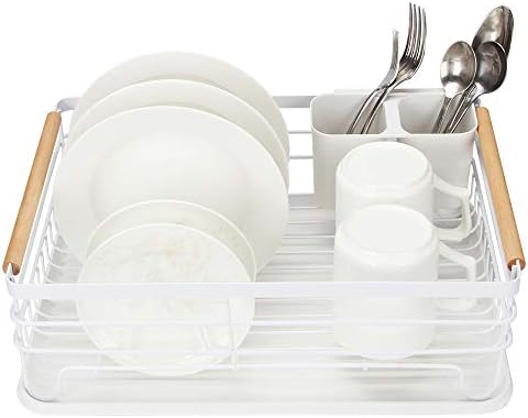 🍽️ This minimalist steel-frame dish rack with wood handles provides an elegant solution to drying dishes in the open. With ample storage and removable utensil holder, every detail in this contemporary design has been thoughtfully executed.