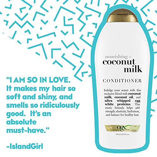 TRANSPORT HAIR TO THE TROPICS: This 25.4-fluid ounce bottle of OGX Nourishing + Coconut Milk Conditioner helps strengthen and hydrate hair, leaving it looking glowing, healthy and beautiful with every use