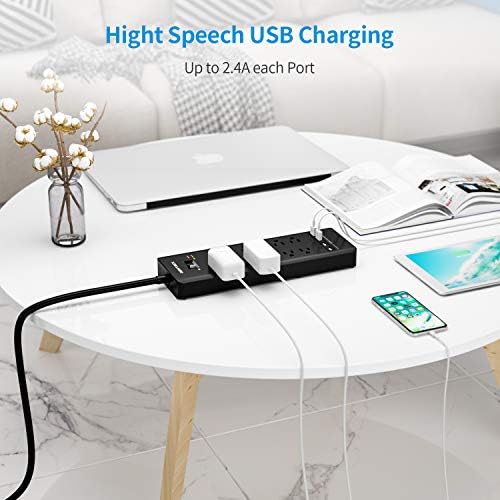 ★Multi Outlets Strip –15 Ac grounded three-pin outlets with flat Plug, multi 5V/2.4A (total 3.4A/18W) USB ports used as USB wall charger, 2 Special design widely spacing AC outlets (2 inches) for large adapters with 8 standard spacing outlets, fast and efficient charging