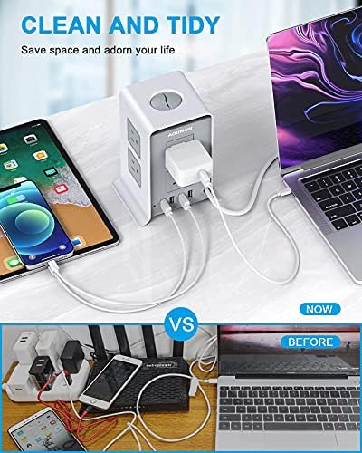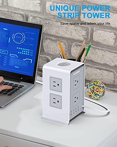 AOUMUN power strip has 8 AC outlets and 4 USB charging ports, wide space between each outlet ensures there no conflicts if 2 big adapters plug in at the same time. Tower design saves more spaces during using process, 10FT extension cord to ensure enough length to you, It is also a surge protector with a maximum output power of 1600W.