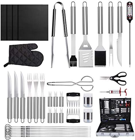 【Most Complete Set: 40-in-1】:The 40 in 1 BBQ set is the most complete grill accessories set on the market that includes everything you need. It includes long tongs x1, scissor tongs x1,long spatula x1, long fork x1, long knife x1, basting brush x1, cleaning brush x1, meat injector x1, meat thermometer x1, pepper shaker x1, salt shaker x1, kitchen shear x1, meat claw x2, small knife x3, small fork x3, grill mat x4, corn holder x6, skewer x8, grill glove x1, Aluminum carry case x1 .