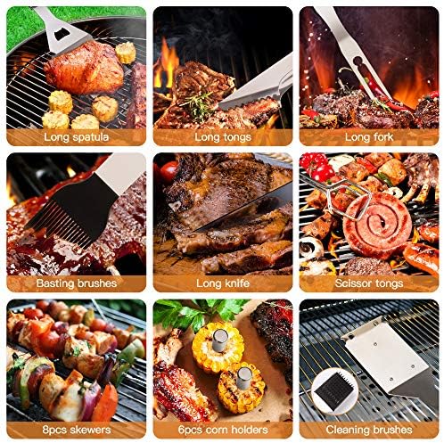 【Elegant Design for Grilling】:You’ll be amazed by how elegant each barbecue tool feels in your hand when you pull them out of the case. Perfect heft, enough length and ergonomic grill handles are designed to make you easily skewer, grab a whole chickens, and flip briskets while enjoying the BBQ time with your families and friends.