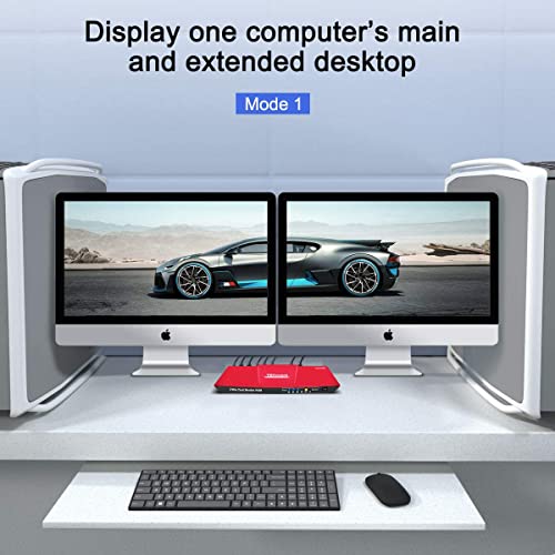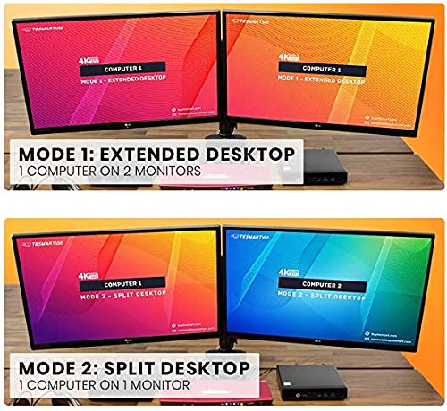 【2 modes of Dual Monitor KVM】 Dual monitor extended desktop (Mode 1). Switch to Mode 2 to split desktop with each PC displaying on 1 monitor simultaneously.