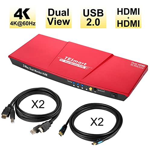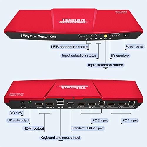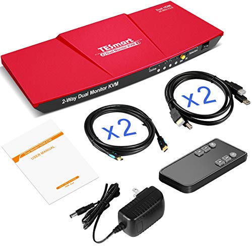 【HDMI + HDMI KVM Switch】 TESmart 2 ports KVM switch, using only 1 set of keyboard, mouse and 2 monitors to control 2 computers, support display one computer’s main and extended desktop. ( Each PC must make 2 video connections for dual monitor setups.)