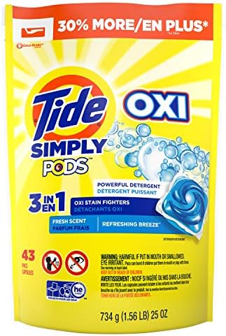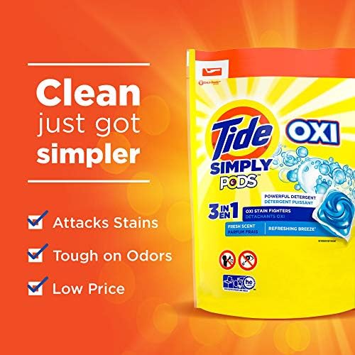 Tide Simply pods +Oxi provides the right clean at just the right price. With 3x the power of baking soda liquid detergent, these laundry detergent pacs dissolve in any temperature. They can be used in front and top loading washing machines, both standard and high efficiency. Place Tide Simply pods +Oxi in the drum. Available in Daybreak fresh and refreshing breeze scents. For 10x the cleaning power, try Tide PODS original. Stain removal result of 1 dose vs 3 of the leading liquid bargain detergent with baking soda in a top load machine stain removal of 1 dose vs. 10x doses of the leading liquid bargain brand