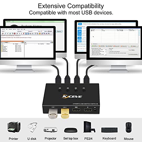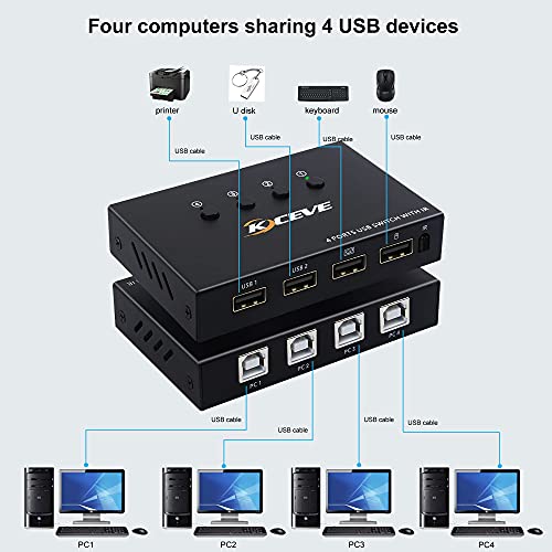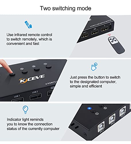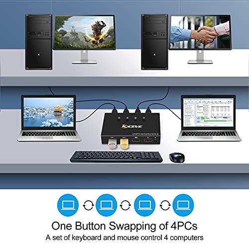 【Multi-port Connection】Plug and play,just connect the keyboard and mouse to this USB KVM,a set of keyboard and mouse can easily control 4 hosts.wireless mouse and mechanical keyboard support.share devices between 4 computers,such as printer,scanner,mice,keyboard,card reader and flash drive.