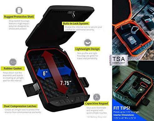 Can be used without a battery and still function as a waterproof case. Powered by a 9V alkaline battery (not included) with a battery life of up to one year under normal use. The front rubber keyhole cover disguises an integrated micro-USB port to power the unit in case of a dead battery. FITMENT: Handgun up to 7.75″ in overall length, 6″ in overall width, and 1.75″ tall. INTERIOR DIMENSIONS: 7.75″ L x 6″ W x 1.75” H