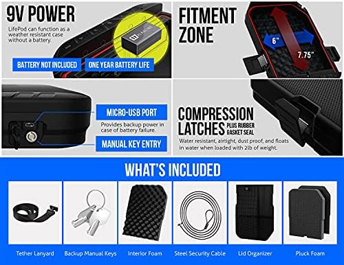 DUAL SIDE COMPRESSION LATCHES combine with an inner rubber gasket to form a watertight seal. LifePod has ENVIRONMENTAL PROTECTION to be water resistant, airtight, dust proof, and floats in water when loaded with 2lb of weight. INCLUDED ACCESSORIES: Nylon tether lanyard, manual keys, crate foam, steel security cable, lid organizer, and pluck foam for custom pocket shapes for stored belongings.