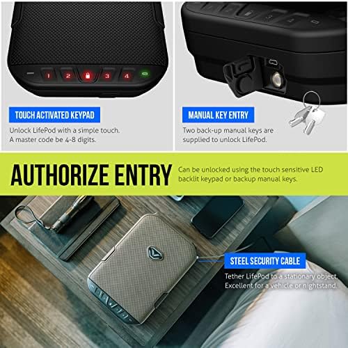 TOUCH ACTIVATED KEYPAD. A unique backlit LED capacitive keypad provides entry of the master code to unlock and quick press to lock action when locking. Backup manual keys are included to unlock LifePod.