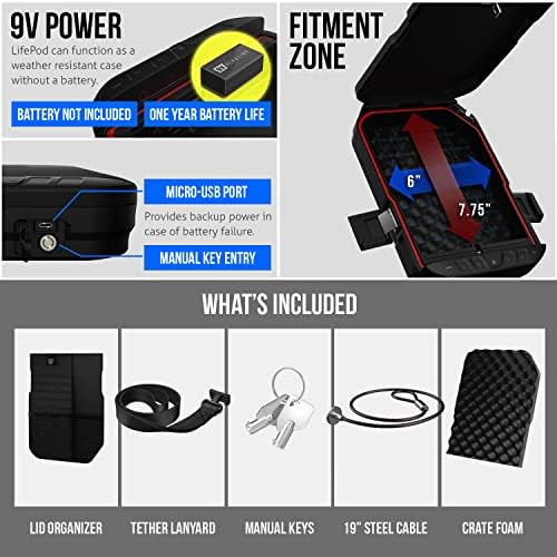 DUAL SIDE COMPRESSION LATCHES combine with an inner rubber gasket to form a watertight seal. LifePod has ENVIRONMENTAL PROTECTION to be water resistant, airtight, dust proof, and floats in water when loaded with 2lb of weight. INCLUDED ACCESSORIES: Nylon tether lanyard, manual keys, crate foam, steel security cable, and lid organizer.