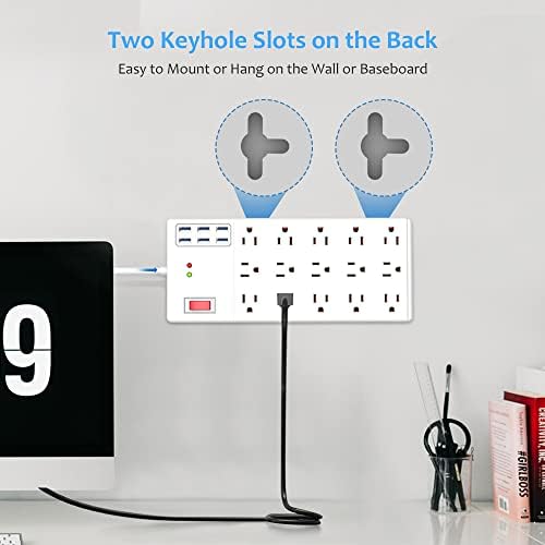 【Wall Mountable】Two keyholes on the back of surge protector for easy wall mounting. Sleek black slim design enable you to place the power strip almost anywhere you’d like