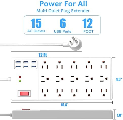 WANDOFO 12ft Long Cord Surge Protector Power Strip with 3 USB Ports and 15 Widely Spaced Outlets 1050J Surge Protector