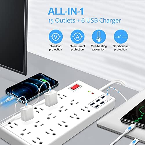 【Widely Spaced Outlets】AC outlets are separated enough to fit big transform plugs without blocking each other. Power and protected 21 devices at once with the 15 Grounded Outlets and 6 USB Ports. Transform your regular outlet into a safe, organized powering station