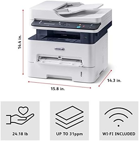 Xerox B205NI is a lightweight, compact, quiet black and white multifunction printer offering print/copy/scan and standard wireless connectivity, 2-line LCD user interface, 40-sheet Automatic Document Feeder, Standard Paper Capacity of 250 sheets/1 sheet manual feed slot while printing on a wide assortment of media types plain, thick, thin, cotton, colored, pre-printed, recycled, transparency, label, cardstock, bond and archive