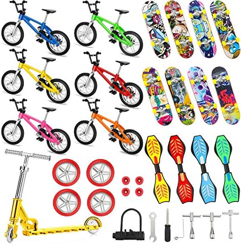 34 Pieces mini finger toys set finger skateboards finger bikes scooter tiny swing board fingertip movement party favors replacement wheels and tools for finger training, assorted color