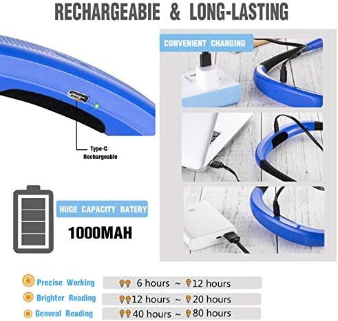 [Eye Caring & Ergonomic Design] No flickering and blue light filter design with advanced LED beads. No eye strain any more for both kids and adults. The arms are supple and adjustable so you can get the angle most comfortable to you. Ergonomic neck around design, and it is totally hands free!