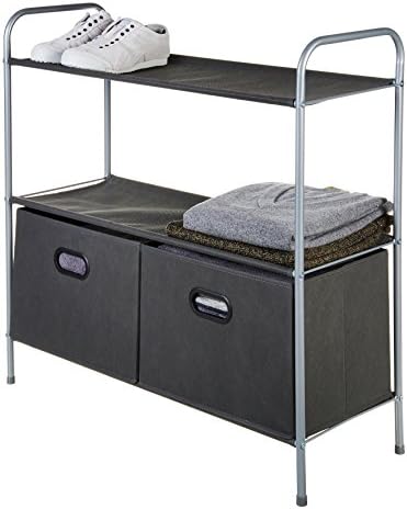 Free-standing closet organizer with 3 fabric shelves and 2 collapsible fabric drawers with handles