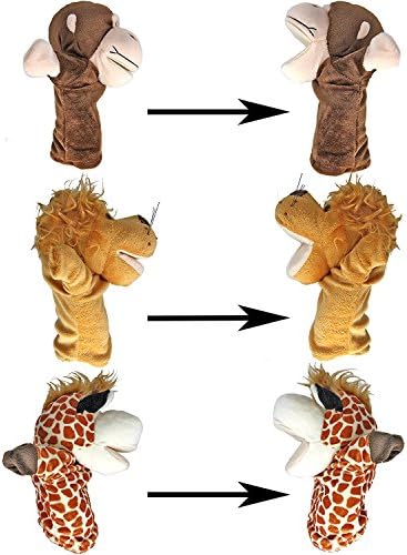 6 Animal hand puppets for kids– elephant, giraffe, lion, bear, raccoon, and monkey.Giraffe, lion, bear, raccoon and monkey hand puppets have a working mouth.Great for encouraging imaginative play, puppet show, a puppet stage, creative for classroom or church setting, motor skills, hand-eye coordination, communication skills, self-confidence, and social-emotional connections.9-inch height 8 inches wide. Fit all age kids.