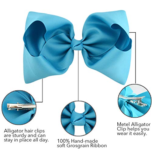 DEEKA Hair Bows are 6″ across (hand-made, please allow the discrepancy of about 1″, so the bows will be 5″-6″ across) with a 2.2 lined alligator clip, using 2″ grosgrain ribbon. One bow weight: 0.5 ounce, Color: 20 solid colors (Shown as the picture)