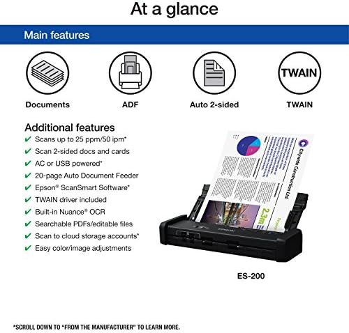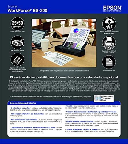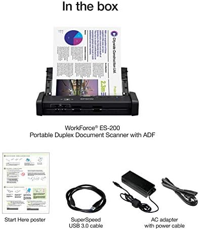 Delivering the fastest scan speeds in its class (1), the WorkForce ES-200 portable duplex document scanner makes it easy to stay organized, whether you’re at the office or on the road. Quickly scan 2-sided documents, business cards and receipts with Single-Step Technology. Featuring a 20-page Auto Document Feeder, the versatile ES-200 performs efficient batch scanning up to 25 ppm/50 ipm (2). Easily scan to cloud storage accounts (3), or to searchable PDFs and editable Word and Excel files using the included Epson ScanSmart Software (3). Built-in Epson Image Processing Technology offers intelligent color and image adjustments. And, you can use either AC or USB power (4) — for convenient portability.