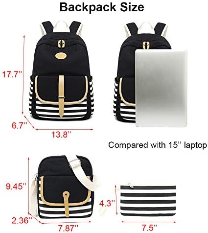 CONSIDERATE DESIGN: Beautiful matching 3 pieces set (school backpack + shoulder bag + pencil case) with a cute stripe design. SIZE: Book Bag: 17.7″L*13.8″H*6.7”W, can put books, fits up to 15.6” computer. Shoulder Bag: 7.87″L*9.45″H*2.36″W, can put small notebook or iPad Mini, can also be served as a small rectangular lunchbox. Pencil Bag: 7.5L* 4.3W, can be used as a makeup bag or wallet.
