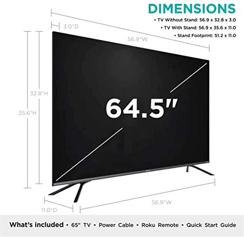 Perfect for presenting your favorite movies, shows, sports, and gaming, the Hisense 65r8f 65-inch 4k ULED smart TV creates astonishing images with enhanced color, details and depth to transform your favorite entertainment into an ultra-new reality. Powered by exclusive technologies to amplify color, contrast, brightness, and smooth motion, Hisense Roku TV r8f series ULED smart TVs combine incredible, ultra-bright 4k detail with the intuitively smart Roku TV to take your TV experience from great to incredible. Great for streaming, cable, satellite, gaming, and free over-the-air TV, this r8f series TV is perfect for presenting your favorite entertainment with enhanced color and more depth. Enjoy all the key moments in fast-paced sports, movies, and games with motion rate 240-image processing, minimizing picture lag to create a clear image without motion blur. The r8f series features a wide color gamut to increase the display’s total array of colors giving you a full spectrum of over a billion colors and amping up the intensity for a more lifelike picture. Roku TV’s simplified home screen and streamlined remote provide easy to access your cable box or HDTV antenna, one-touch access to favorite channels and streaming services, and access to over 5,000 streaming channels and 500,000 movies and TV episodes. Control the TV with your iOS or android device via the easy-to-use Roku TV remote app, or use your voice to power your TV on and off, change channels, search for shows, and more through an Alexa-enabled device (sold separately). The vesa measurements for this TV are 400 x 200mm, for wall mounting purposes. Wall mount sold separately. Measuring 56.9 by 32.8 by 3.0 inches (56.9 by 35.6 by 11 inches with included stand, LxWxH), the 65r8f is backed by a 1-year manufacturer’s warranty, and includes a Roku remote (batteries included), power cable, and quick start guide.