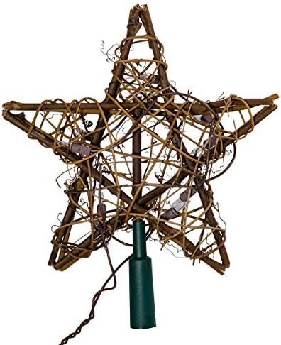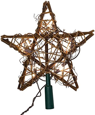 This Kurt Adler 10-light rattan natural star treetop is a unique way to decorate your Christmas tree and accent its lighting. Made of rattan, or palms, this tree topper has a rough-yet-beautiful natural look, and it is wrapped in brown wire with light bulbs to give off a warm glow. For indoor use only, this set comes with a 60-Inch brown lead wire, a 12-volt 0.08a clear bulb, 4 bulbs, and 1 fuse.