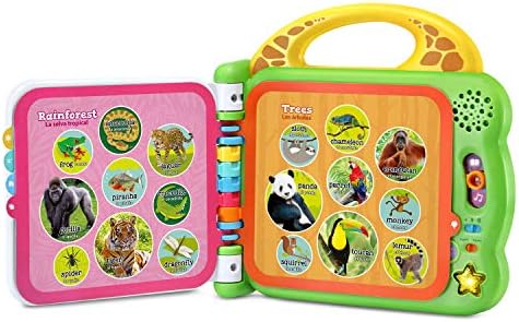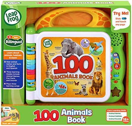 Hold 100 animals in your hands with the touch-sensitive pages of the 100 Animals Book ! Six double-sided, interactive pages feature animals from 12 habitats and environments. Kids have a natural curiosity about animals, and this book provides lots of opportunities for exploration with illustrations and photographs of animals from the desert, savanna, rain forest and more. Three modes teach about animal names, animal sounds and fun facts on each page. Switch the language setting to hear about the animals and listen to songs in either English or Spanish. Fun facts about animals promote early science awareness, making this book a must-have addition to every little learner’s library. Intended for ages 18+ months. Requires 2 AA batteries. Batteries included for demo purposes only. New batteries recommended for regular use.
