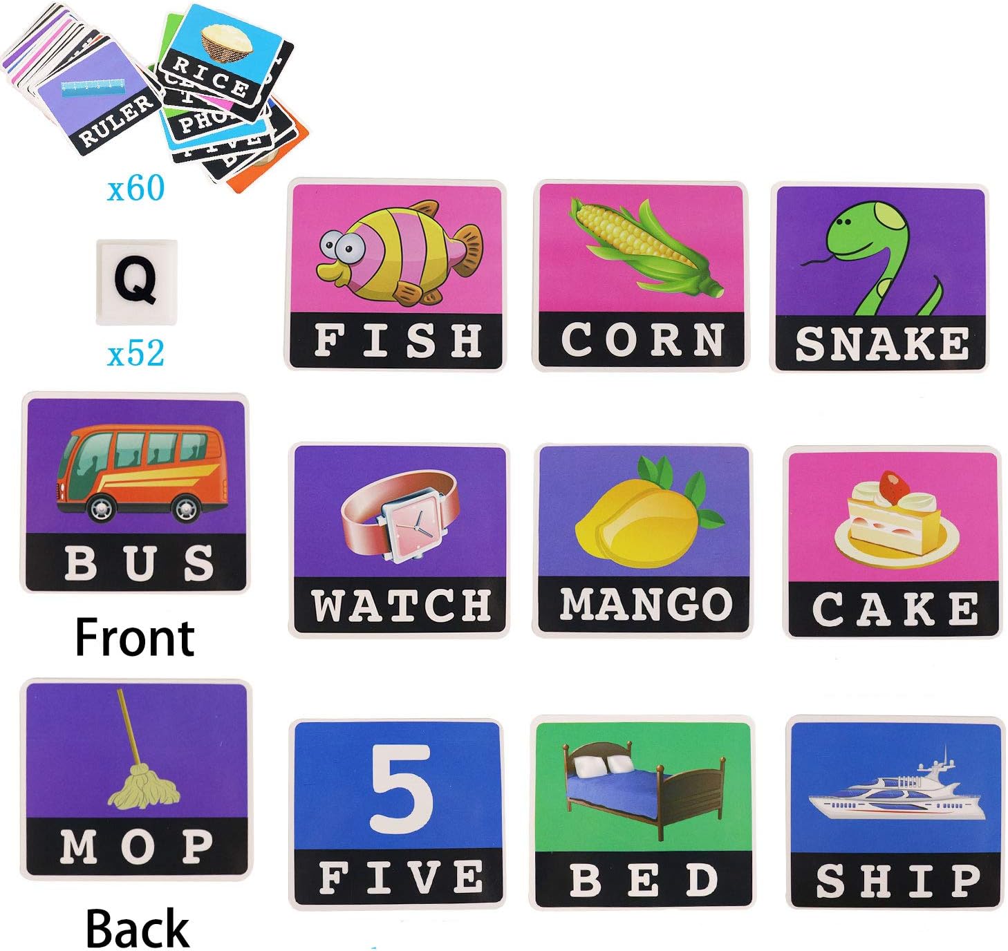 Package Include — 1*Board, 60 Flash Cards (The pattern of cards have sight words included animals, fruits, engineering vehicles and so on), 52 letters plastic bricks.