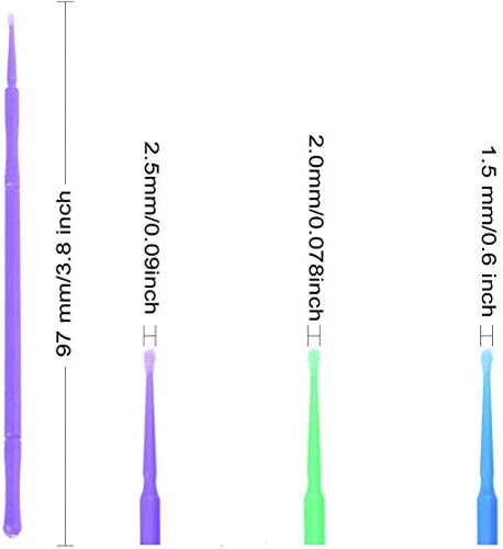 Size and color: there are 100 pieces large size, 100 pieces medium size and 100 pieces touch up paint brushes in small size, large size measures approx. 2.5 mm in diameter, and small size is about 1.5 mm in diameter,and medium size is about 2 mm in diameter.