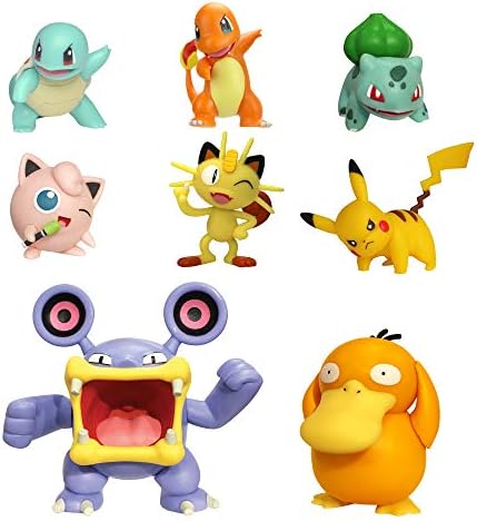 Contains five two inch figures and 2 three inch figures: 2” Pikachu, 2” Bulbasaur, 2” Squirtle, 2” Charmander, 2” Meowth, 3” Loudred, and 3” Psyduck