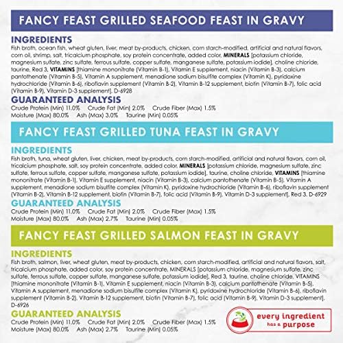 Make mealtime a memorable occasion when you serve Purina Fancy Feast Grilled Seafood Feast Collection wet cat food. Tender cuts of fish and seafood deliver the ocean flavors cats crave, and the tender texture of this soft cat food entices your cat to eat every scrumptious bite. Each recipe features a savory gravy that balances out these mouthwatering entrees, and high quality ingredients provide an exceptional level of taste. With essential vitamins and minerals to support her overall health in every serving, this gourmet cat food lets you feel good about the meals you serve. Offer up a different recipe at every feeding to keep her interested in what’s being put in her dish, and let her delight in the rich flavors. She is sure to love the gourmet flavor combinations, and you can rest easy knowing she’s getting 100 percent complete and balanced nutrition for adult cats. Get her favorite soft cat food delivered with just a few mouse clicks when you order this Purina recipe from Amazon.com.