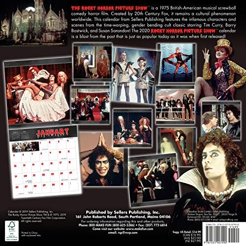 This 1975 British-American musical screwball comedy horror film remains a cultural phenomenon worldwide. Featuring the infamous characters and scenes from the time-warping, gender-bending cult classic starring Tim Curry, Barry Bostic, Susan Sarandon and Meatloaf! The 2020 Rocky Horror Picture Show calendar is a blast from the past that is just as popular today as it was when first released! This calendar is perfect as décor in your home, kitchen, or office and easily helps to keep track of important dates, contacts, and other events at a glance. Each calendar month is easy to glance at and see what responsibilities you have coming up, so make sure you stay organized through the year! Personalization is easy with different colors for appointments and trips, add stickers or stickie notes for a quick reference, or create your own system of symbols and abbreviations. Best-selling calendar title! Printed on high-quality paper. Features full-color pages. Includes all major and significant holidays. Carefully curated images throughout. Great for families, students, and professionals. Give as a gift for any occasion. Stay organized and on track all year. Perfect for the home or office. Available in multiple formats. Sellers Publishing offers more than 175 calendars in seven formats. Choose from Wall Calendars, Boxed Daily Calendars, Weekly Engagement Calendars, Desk Pads, Mini Calendars, Planner Calendars, and 2-Year Pocket Planners. Sellers Publishing, creator of the High Note collection, is an award-winning publisher of calendars, greeting cards, books, and journals.